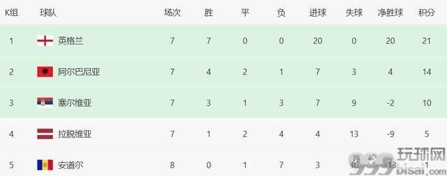 本小组积分榜上,挪威7场21分29个净胜球,意大利18分12个净胜球。尽管从理论上来说,意大利还有获得小组第1的希望,但17个净胜球的巨大差距,意味着希望无限接近于零。意大利需要打出9-0、10-1这样净胜9球或以上的超级大胜,才能完成对挪威的超越,这显然是无法实现的事情。挪威时隔28年重返世界杯,已是铁板钉钉之事。 【K组:大局已定】 17日凌晨1点,阿尔巴尼亚vs英格兰,塞尔维亚vs拉脱维亚。